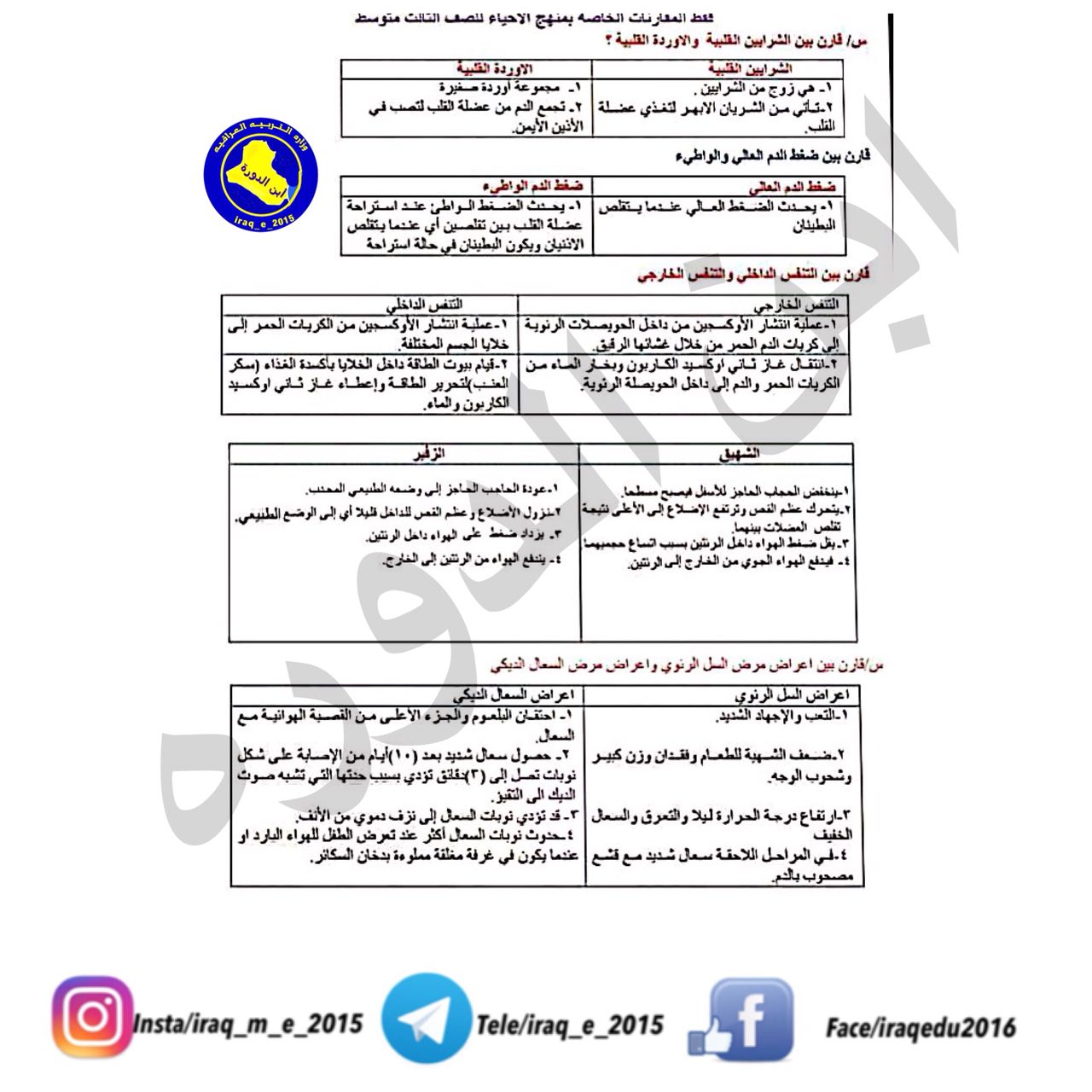 ملزمة احياء ملخصات ومقارنات واسئلة الاحياء للصف الثالث متوسط الدور الاول 2018