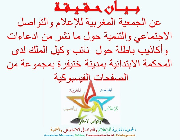 الجمعية المغربية للإعلام والتواصل الاجتماعي والتنمية تدين الإشاعات المطلوقة في حق نائب وكيل الملك بخنيفرة