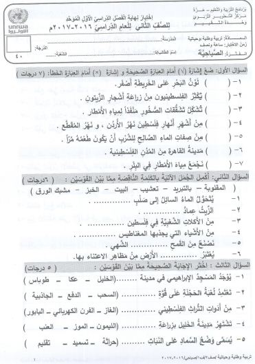 اختبار التربية الوطنية والحياتية للصف الثاني نهاية الفصل الأول 2017 المكتبة الفلسطينية الشاملة