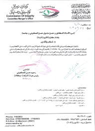 شكر وتقدير من هيئة النزاهة لأحد أساتذة كلية التربية للبنات في جامعة بغداد جامعة بغداد