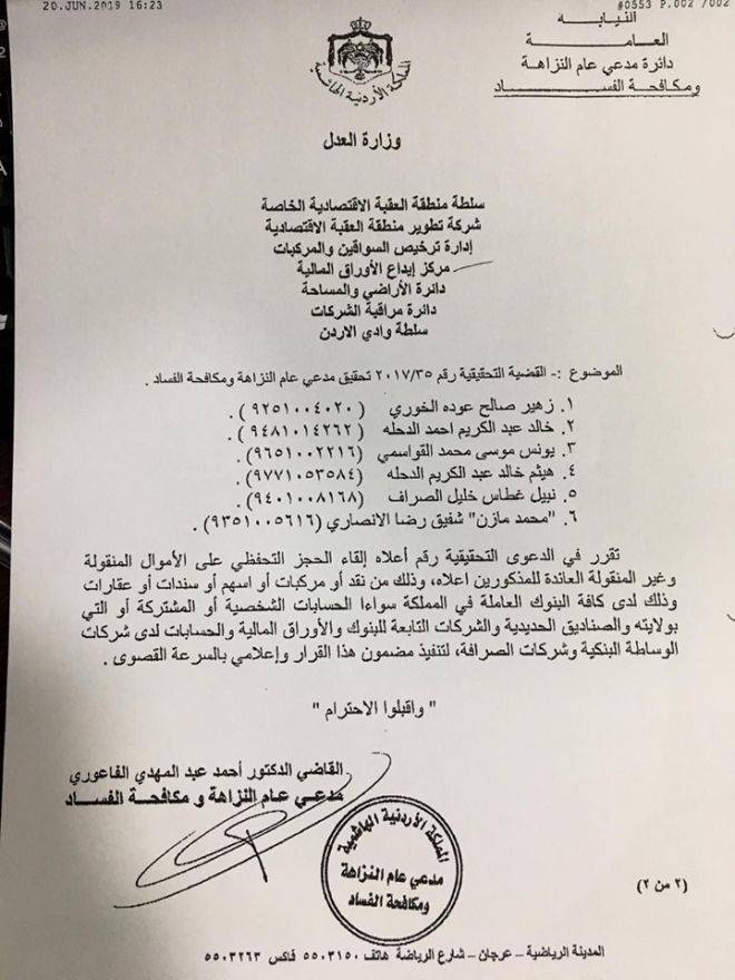 الحجز على اموال هيثم الدحلة ويونس القواسمي و4 آخرين بقضية فساد تعمير وثيقة