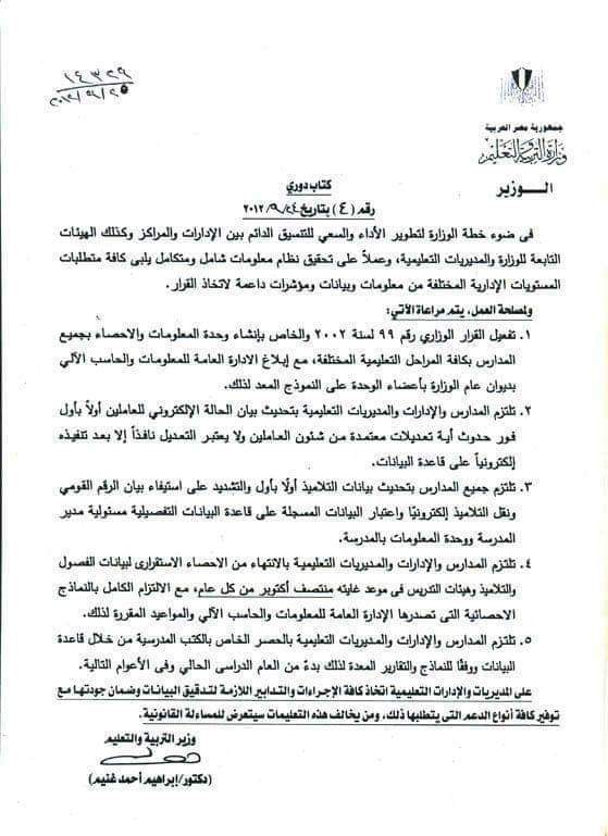 نشرة الوزارة رقم 1905 بعدم تكليف المعلمين على اختلاف تخصصاتهم باى اعمال تخالف التعليم والتعلم