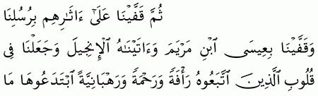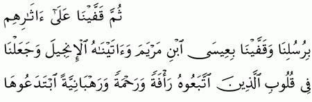 ث م ق ف ي ن ا ع ل ى آث ار ه م ب ر س ل ن ا و ق ف ي ن ا ب ع يس ى اب ن م ر ي م و آت ي ن اه ال إ ن ج يل و ج ع ل ن ا ف ي ق ل وب ال ذ ين ات ب ع وه ر أ ف ة و ر ح م ة و ر ه ب ان ي ة اب ت د ع وه ا م ا ك ت ب ن اه ا ع ل ي ه م إ ل ا اب ت غ اء