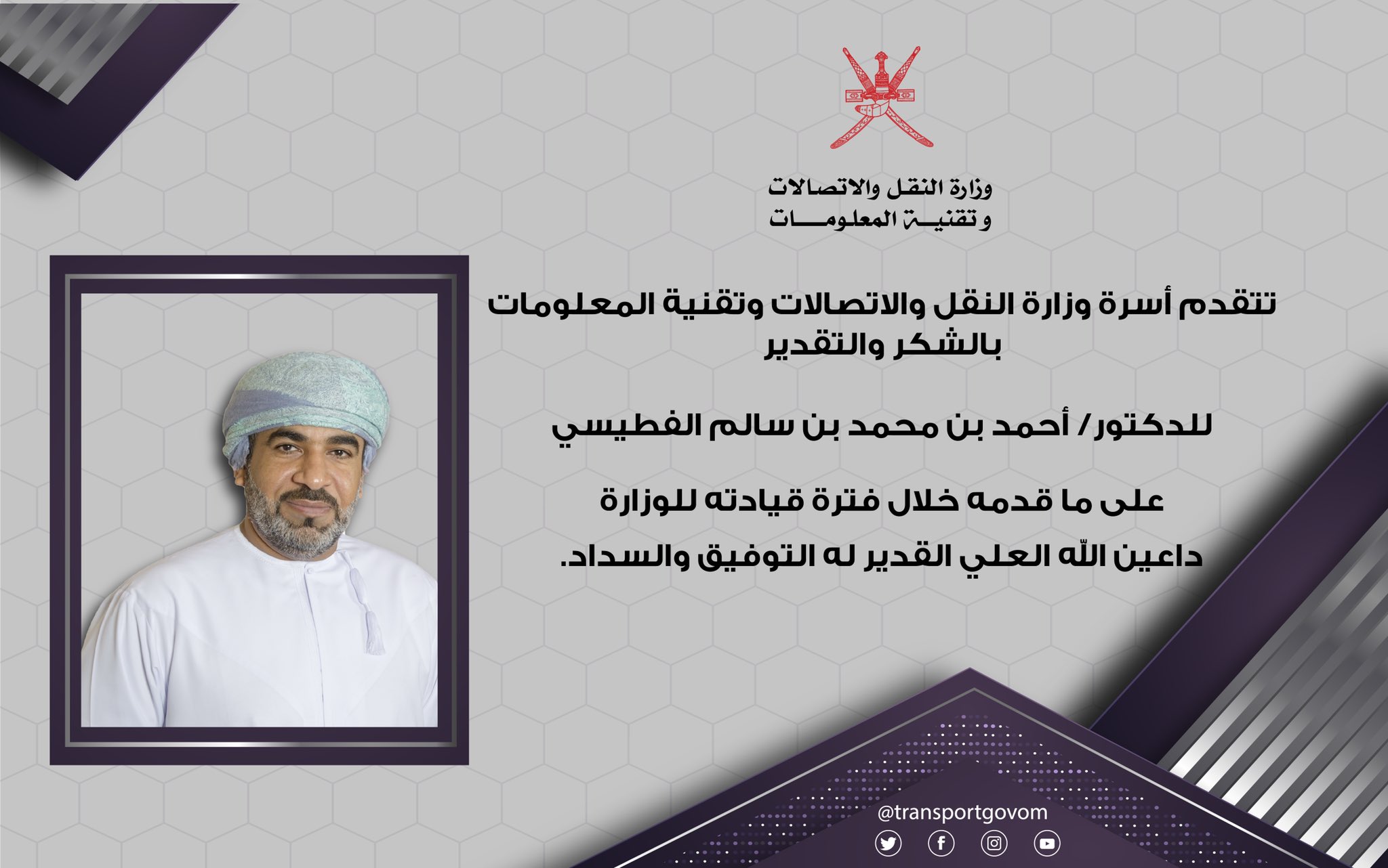 وزارة النقل والاتصالات وتقنية المعلومات On Twitter تتقدم أسرة وزارة النقل والاتصالات وتقنية المعلومات بالشكر والتقدير للدكتور أحمد بن محمد بن سالم الفطيسي Ahmedalfutaisi على ما قدمه خلال فترة قيادته للوزارة داعين