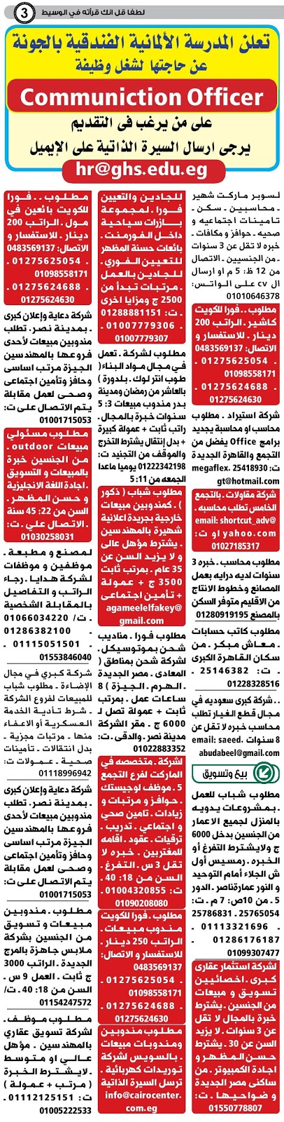 اعلانات وظائف خالية من جرنال الوسيط في الكويت عدد الثلاثاء 3 5 2016