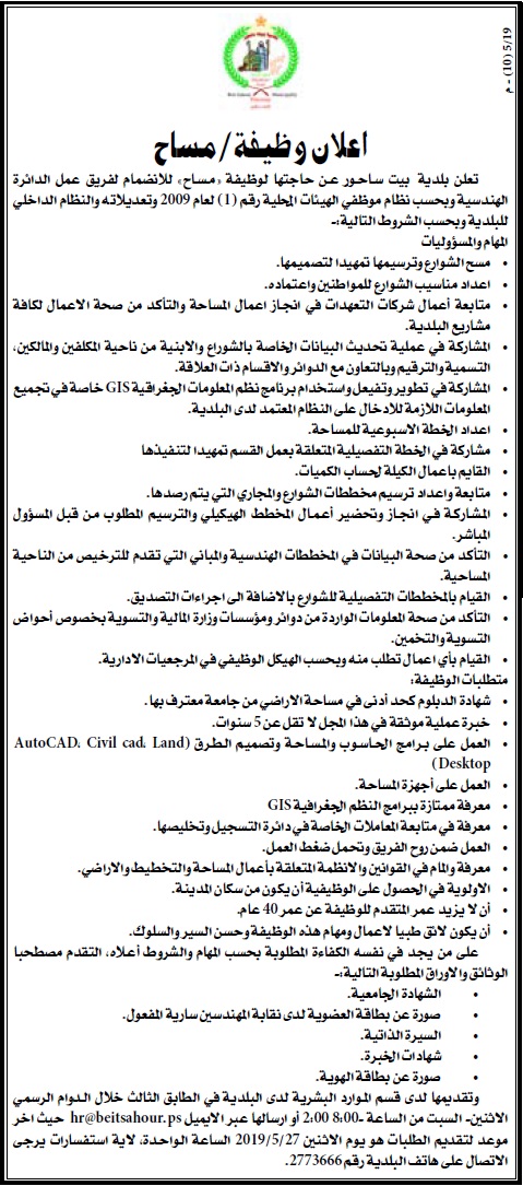 Civil Service Bureau اعلان صادر عن بلدية الخالدية لاشغال وظيفة مساح