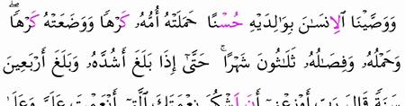 و و ص ي ن ا ال إ ن س ان ب و ال د ي ه إ ح س ان ا ح م ل ت ه أ م ه ك ر ه ا و و ض ع ت ه ك ر ه ا و ح م ل ه و ف ص ال ه ث ل اث ون ش ه ر ا ح ت ى إ ذ ا ب ل غ أ ش د ه و ب ل غ أ ر ب ع ين س ن ة ق ال ر ب أ و ز ع ن ي أ ن أ ش ك ر ن ع م ت ك