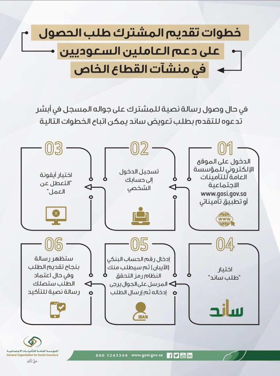 التأمينات الاجتماعية On Twitter في حال قبول طلب الدعم الم قدم من قبل المنشأة وتوفرت الشروط سوف ترد رسالة نصية للمشترك للتقدم بطلب تعويض ساند وذلك عن طريق حسابه في موقع المؤسسة العامة