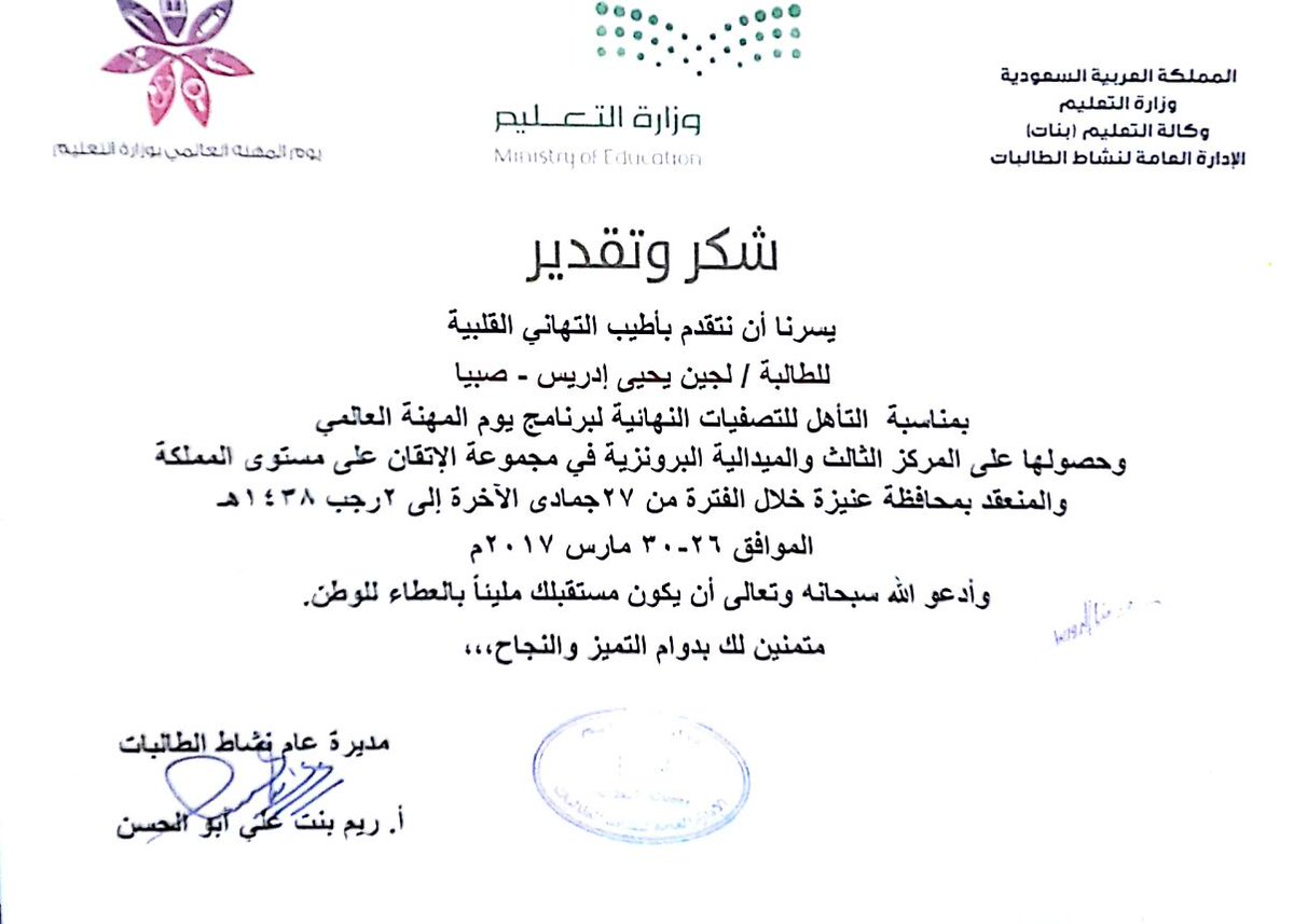 مهارة علمية On Twitter نبارك لقسم نشاط الطالبات حصوله على خطاب شكر وزاري لمشاركته في مشروع يوم المهنة العالمي لعام 1438 هـ وحصول الطالبة على مركز متقدم Https T Co Fkkxgg59yb